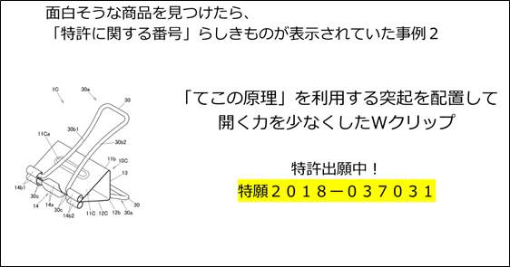 図4には、番号から調べる二つ目の仮想事例を紹介しています。この事例2は、大手文房具メーカーのプレスリリースでダブルクリップの新商品が紹介されており、特許出願していることをアピールするために、特許の出願番号である「特願2018-037031」が記載されていたという仮想事例です。