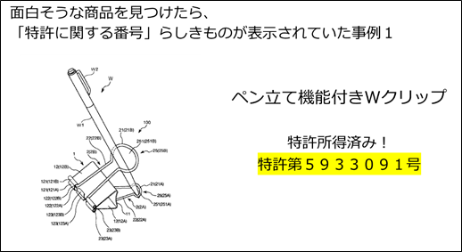 図1には、番号から調べる仮想事例の一つ目を紹介しています。この事例1は、アイデア商品を販売しているお店で「ペン立て機能を有するWクリップ」を見つけ、さらに、横に置いてあったカタログを見ていると、「特許第5933091号」と記載されており、特許の内容が気になったという仮想事例です。