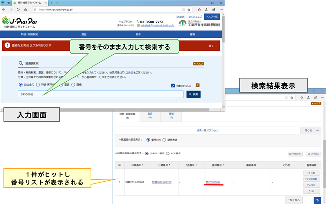 図2は、最初に表示される簡易検索の入力画面と、検索結果のリスト表示画面になります。「5933091」は、特許番号(登録番号)に相当しますが、番号の種類を気にすることなく、7桁の番号を入力して検索すれば、対応する特許をヒットさせることができます。