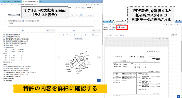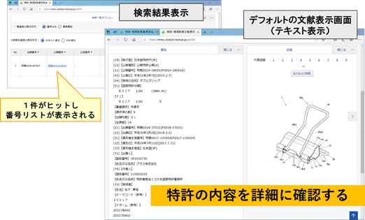 そして、「照会」のボタンアイコンをクリックすると、図6の検索結果表示画面が表示され、さらに、公開番号の欄の「特開2019-018551」の番号のリンクをクリックすると、図6右側の文献表示画面が表示され、特許の内容を確認することができます。