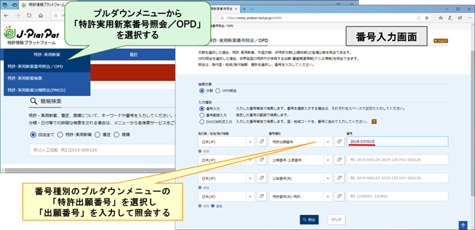 図5は、トップページの「特許・実用新案」のバー表示にマウスを合わせるとプルダウン表示される「特許・実用新案番号照会/OPD」のメニューと、それを選択すると表示される番号入力画面になります。「番号種別」の項目で「特許出願番号」を選択し、「番号」の欄に「2018-037031」と入力した画面になります。