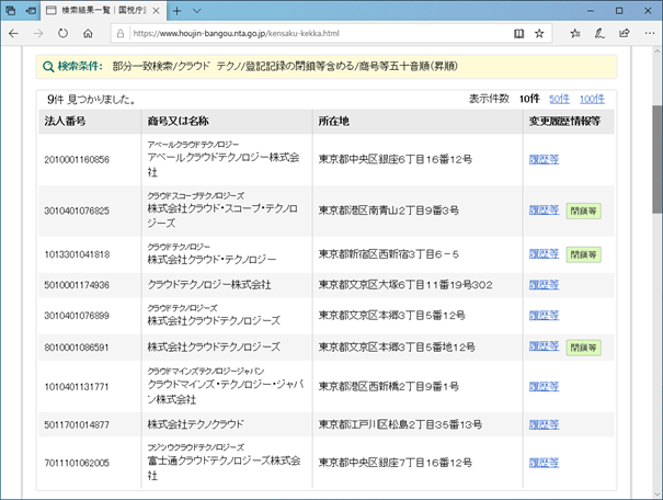 例えば、「クラウドサービスを提供する会社で、社名に『クラウド』と『テクノ』という文字が入っていたと思う。その会社の特許を調べてほしい。クラウドテクノロジー?、クラウドテクノリンク?、、、」といったリクエストを受けた際に、法人番号公表サイトで「クラウド テクノ」と入力して部分一致検索を実施すると9件の会社がヒットします。この中から調べるべき会社の正式名称を特定することができると思います。