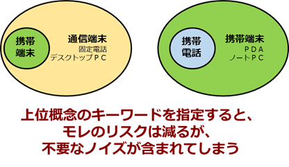 キーワード指定検索を実施する際には類義語を展開してOR検索を実施すべきですが、関連するキーワードをなんでもかんでも指定するのではなく、指定するキーワードが含む概念と、ヒットさせたい概念とのギャップをしっかりと見極める必要があります。特に今回の失敗事例のように、上位概念のキーワードを指定する場合には、調査モレの危険性は低くなりますが、不要なノイズを増やしてしまいます。では、ノイズが増えるからと言って、上位概念のキーワードを使うのを止めるのではなく、さらに関連する概念を掛け合わせて検索することでノイズの増加を防ぐことができると思います。