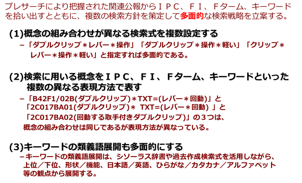 検索式の立案段階において、調査モレを防ぎ、不要なノイズを少なくするためには、ヒットさせたい集合を、多面的に複数の検索ラインで指定することが必要になると思います。
