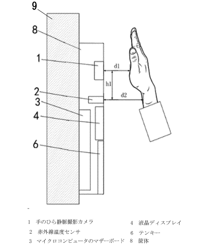 手のひら静脈を使って、非接触で入退室管理と検温機能を行える装置に関する特許です。おでこに比べて手首の温度は外界の温度や湿度の影響を受けにくく、かつ真の体温からの偏差が小さいそうです。