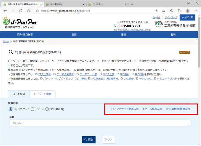 特許・実用新案分類照会(PMGS)の中に「FI/ファセット簡易表示」「Fターム簡易表示」「IPC(最新版)簡易表示」のメニューが追加されました。