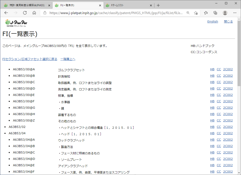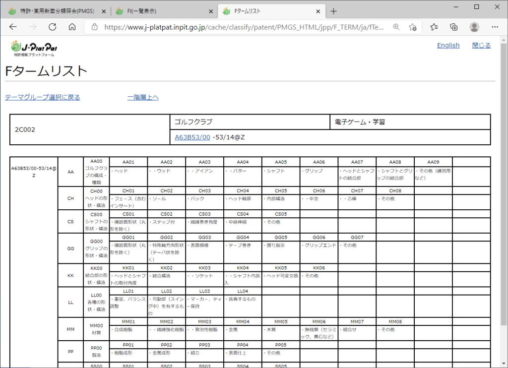 Fターム簡易表示は昔からなじみ深いマトリクス表示形式のFタームコード表が表示され、全体を俯瞰しながら細分類の内容を確認できます。