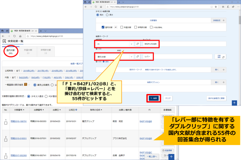 1行目の検索項目は「FI」を選択し、入力欄には「B42F1/02@B」と入力しています。さらに、2行目の検索項目は「要約/抄録」を選択し、入力欄には「レバー」と入力してから検索ボタンをクリックします。そうすると、検索結果表示の画面のように、国内文献のヒット件数とともにヒットした特許の目次一覧が表示されます。