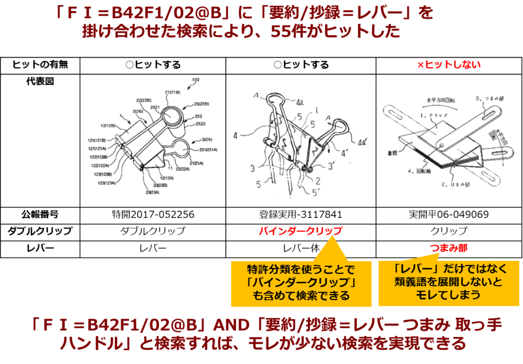 3件のうち、対比表の左側と真ん中の公報はヒットしたのですが、右側の実開平06-049069はヒットしていません。3件ともに、ダブルクリップのFIである「B42F1/02@B」は付与されていたのですが、右側の実開平06-049069では「レバー」というキーワードは使用されていなかったのです。「レバー」という表現ではなく、「つまみ部」というキーワードが用いられていたのです。