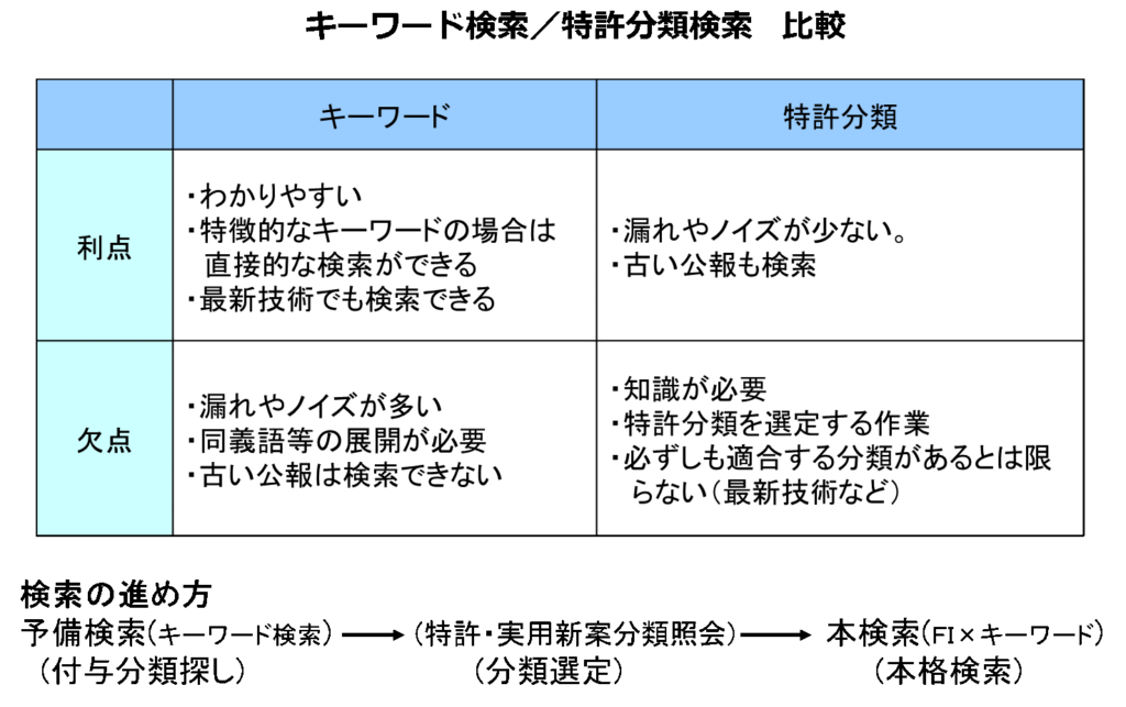 以上のようなキーワード検索と分類検索の特性を踏まえて、特許調査の場面においては、キーワード検索は予備検索の段階で活用され、予備検索により特定された特許分類を活用して、特許分類検索もしくは特許分類×キーワードの検索を本検索として実施していくことになります。