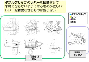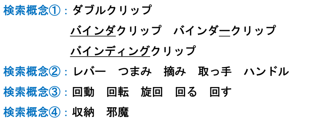 このように、周辺にはどのような構造のダブルクリップが存在するのかを想定しながら、今回の調査で欲しい部分はどこなのかを明確にイメージしておくことは重要です。検索式の検討段階のみならず、スクリーニング段階でも要不要の判断の役に立つものと思われます。