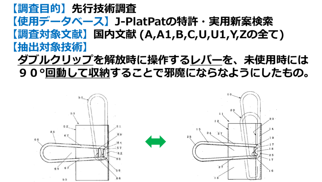 特許検索講座初級編の締めくくりとして、J-PlatPatを使って先行技術調査を実施した特許調査事例を紹介します。「レバー回動収納式のダブルクリップ」に関する発明アイデアを特許出願するにあたり、類似する先行技術文献を抽出することを目的とした特許調査です。特許調査の内容を図33に示しました。