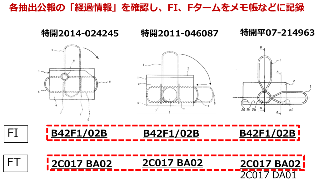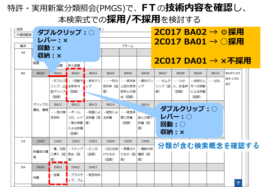 抽出した3件に付与されていた3つのFタームのうち、「2C017DA01」は検索に使いたい概念とは関係しないので採用を見送りました。残りの2つについてはダブルクリップに関連する内容であり、採用することにしました。「2C017BA02」については、「ダブルクリップ」と「レバー」と「回動」の概念を含んでおり、特に関連性が高いFタームであると思われます。