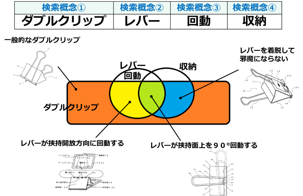 今回の調査テーマで用いる検索概念は「ダブルクリップ」「レバー」「回動」「収納」の4つを選択しました。そして、選択した概念の組み合わせをベン図に表すとともに、抽出対象とする公報は、この4つの概念をすべて含む、黄緑色の部分に含まれるものとしました。参考までに、ベン図で表される各集合の重なりの部分にどのような構造のダブルクリップが含まれるのかを考えてみました。青色の部分には回動収納以外の方法でレバーを収納するものが含まれます。また、黄色の部分には、収納目的ではないが、レバーが回動するものが含まれます。