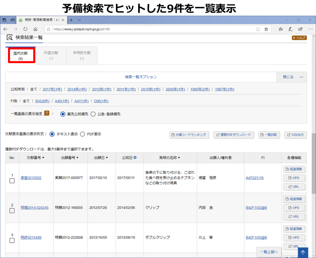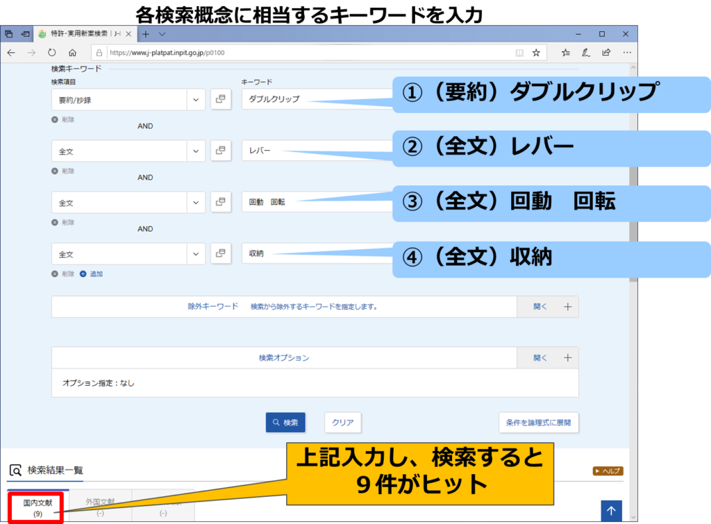 具体的には、1行目は要約/抄録中に「ダブルクリップ」を含み、2行目は全文中に「レバー」を含み、3行目は全文中に「回動もしくは回転」を含み、4行目は全文中に「収納」のキーワードを含むものを指定しました。各行間の検索条件はAND検索です。その結果、ヒット件数は9件でした。