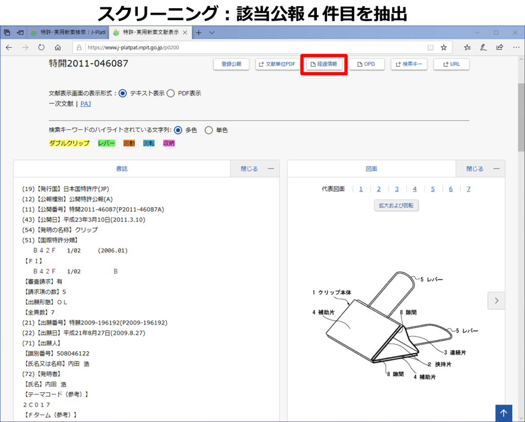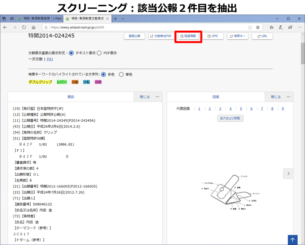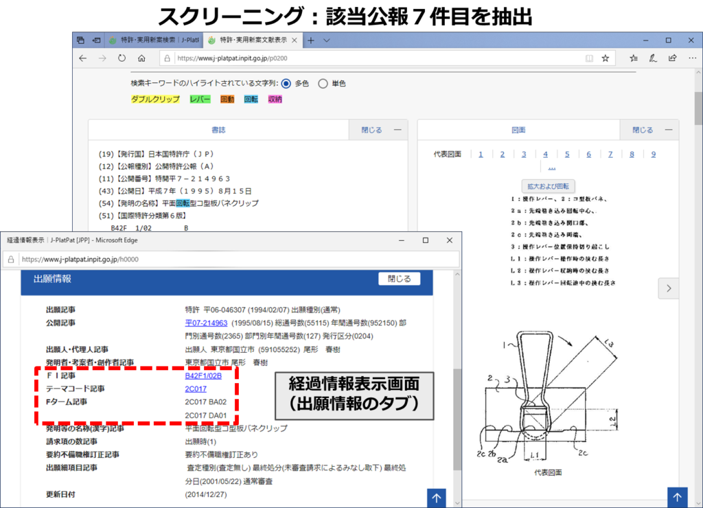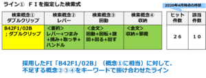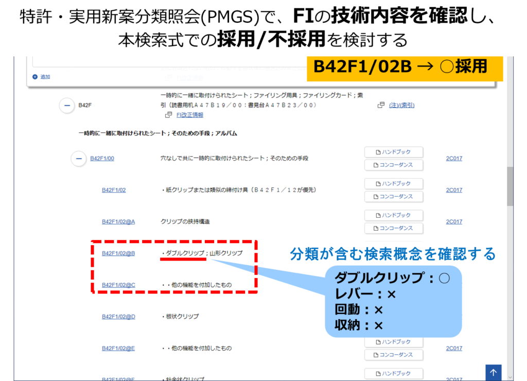 抽出した3件に共通して付与されていた「B42F1/02B」は、ダブルクリップに関する特許分類であり、採用することに決めました。ただし、「B42F1/02B」が有する概念は「ダブルクリップ」の概念のみであり、「レバー、回動、収納」の概念は含んでいないことも明確にしておきます。(含まれていない概念については、キーワードを掛け合わせるなどしないと、欲しい回答集合は得られないということです。)