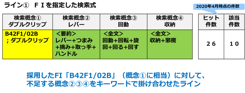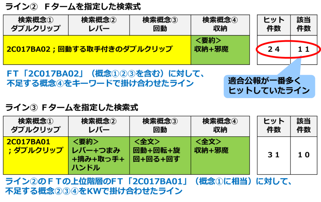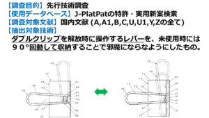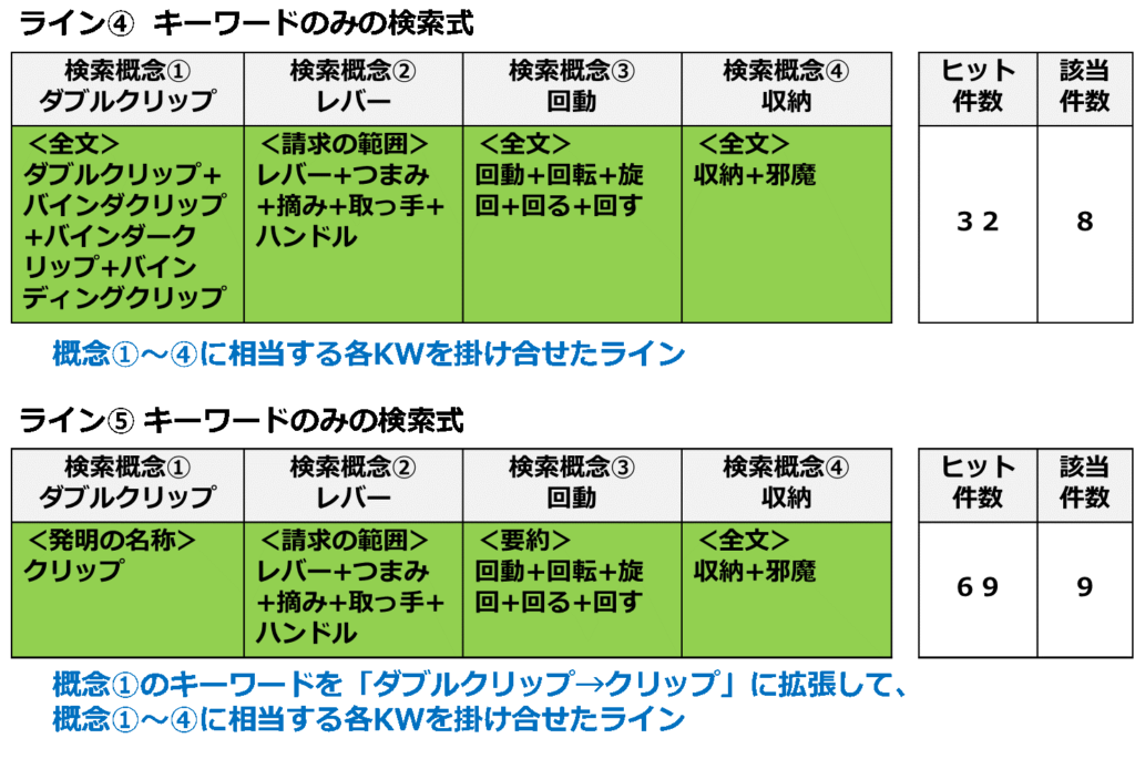 「ダブルクリップ」の概念を表すキーワードに対して、「レバー、回動、収納」の概念のキーワードを掛け合わせた検索式を立案するとともに、「ダブルクリップ」の概念を拡張して「クリップ」というキーワード部分だけを指定した検索式についても立案検討しました。