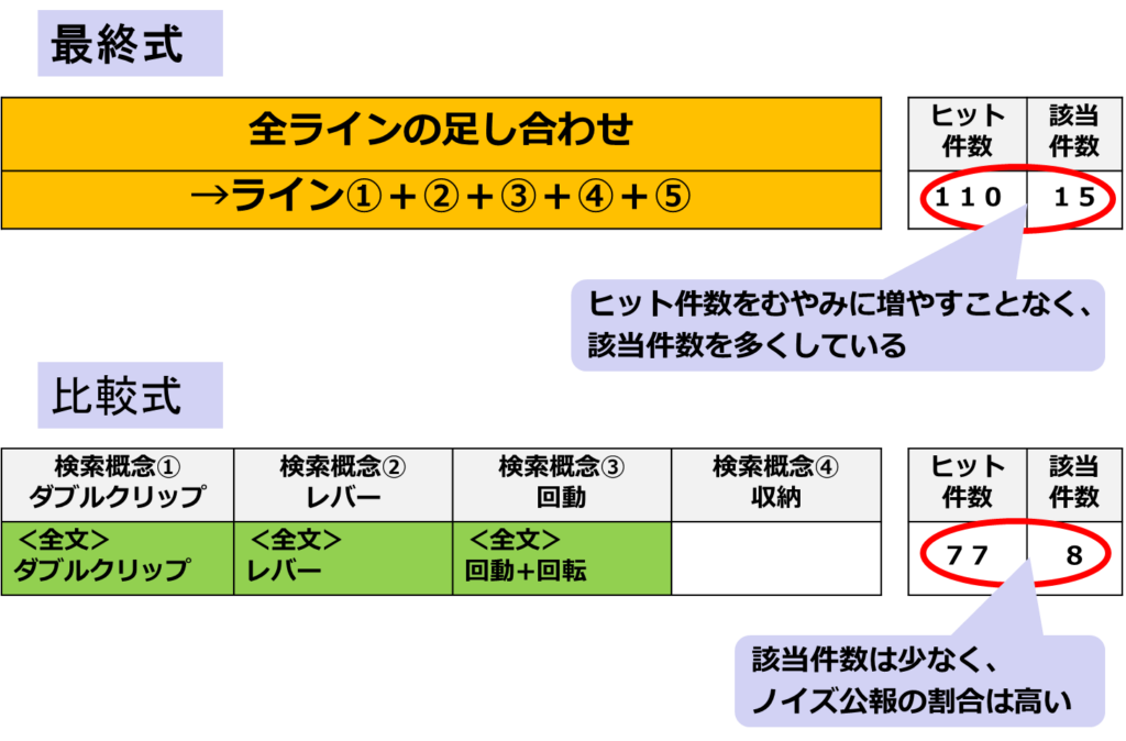 ちなみに、思いつくキーワードのみを使って検索を実施した場合と比較検討も行いました。比較式に示した検索を実施すると、ヒット件数は77件と少なく、適合公報の該当件数も半分くらいになっており、ノイズ公報の割合が多いことが分かりました。