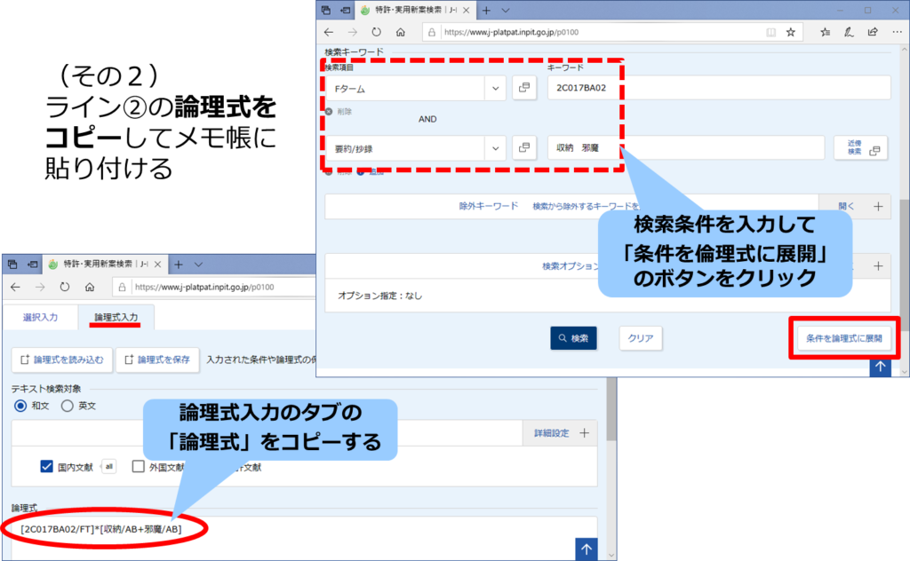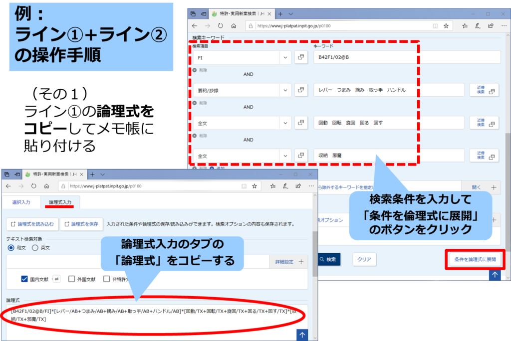 検索条件を入力して検索を実行した後に、「条件を論理式に展開」というボタンをクリックすると、「倫理式入力」のタブに表示が切り替わり、論理式の欄に実行した検索の論理式が作成されます。そこで、それぞれの検索ラインを実行して得られる検索式を、それぞれコピーして、メモ帳に貼り付けておきます。