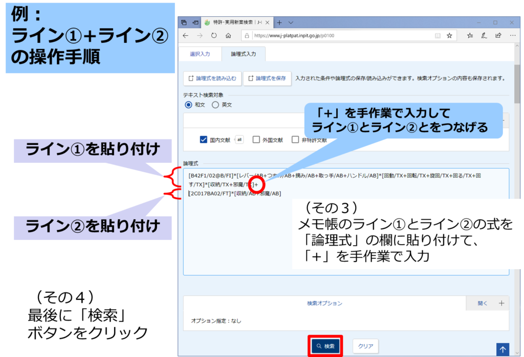 次に、メモ帳にコピーしたそれぞれの論理式を貼り付けて、ラインとラインの間を「+」でつなげれば、全てのラインを足し合わせた検索論理式となり、「検索」ボタンをクリックすると全ラインを足し合わせた回答集合が得られます。