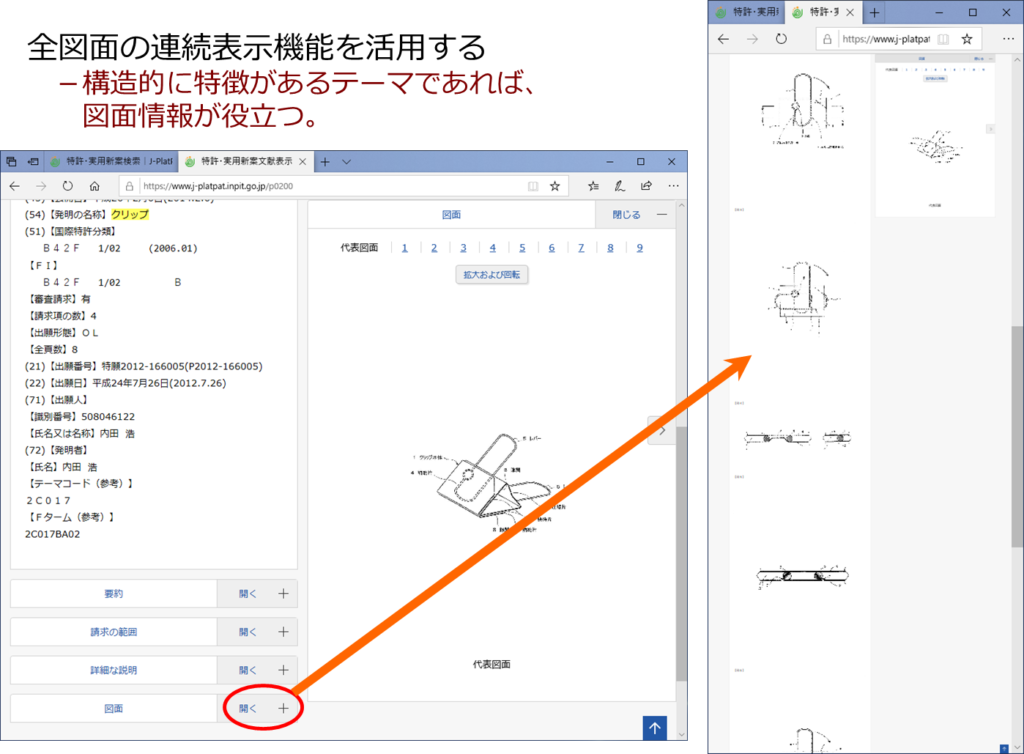 図49には、J-PlatPatで全図面スクリーニングを実施する方法を紹介しました。文献表示画面の一番下にある「図面」の項目の「開く」をクリックすると、全ての図面が連続表示されるようになります。