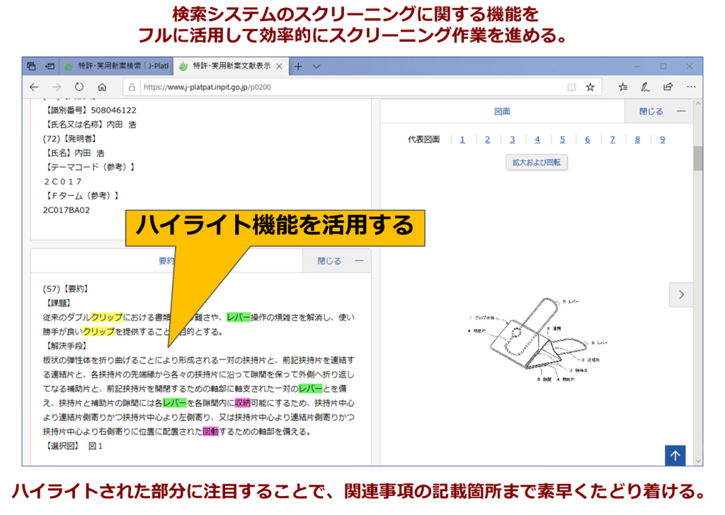 最後に、J-PlatPatでのスクリーニング作業について説明します。全てのラインを足し合わせた回答集合に含まれる特許公報を、順番に1件ずつ精査しながら適合公報か否かをチェックしても構いませんし、1次スクリーニングから2次スクリーニングへと段階的にスクリーニングを実施しても良いかもしれません。