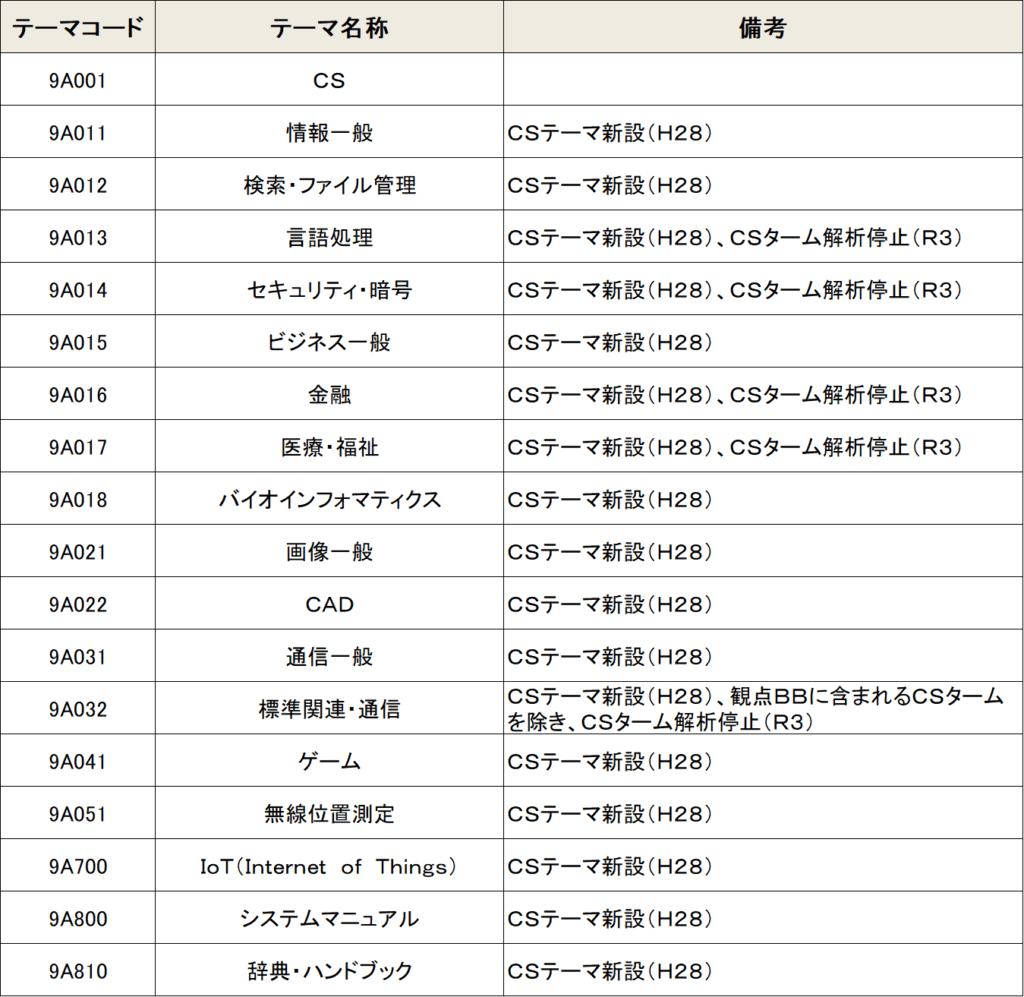 しかし、『9A001』以外のテーマコードについては、テーマの設定はされているものの、J-PlatPatで検索しても1件もヒットしません。解析停止となっているテーマもあるようですが、解析停止の有無にかかわらず、『9A001』以外のテーマコードでは特許情報はヒットしません。つまり、『9A001』以外のテーマについては非特許文献に対してのみCSタームが付与されていると推測されます。