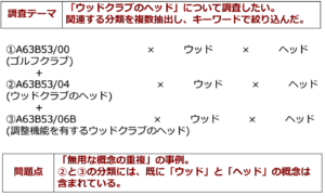 例えば、発明の名称が「ゴルフクラブ」と表現されていても、もしくは、ゴルフクラブの種類の1つである「パタークラブ」と表現されていても、どちらも『ゴルフクラブの特許分類』が付与されているので、特許分類指定検索を実施した場合はどちらもヒットします。しかし、キーワード指定検索で「ゴルフクラブ」と検索すると、「パタークラブ」としか記載されていない特許公報はヒットしません。