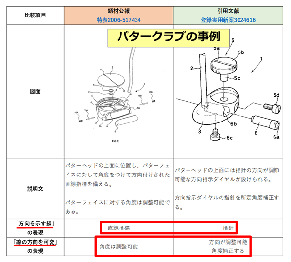 パターヘッドの上面に打球の方向を示す直線を設けるとともに、直線の方向を可変できるようにしたパタークラブの出願を題材公報(対比表の左側)とした場合に、題材公報に対する拒絶理由通知書の中で引用文献(対比表の右側)が提示されました。この題材公報と引用文献との対比表を図1に示しました。