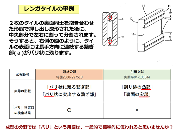 この事例では、2枚のタイルの裏面同士を抱き合わせた形態で押出成形された後に、中央部分で左右に割って分割されますが、そうすると、タイルの裏側には長手方向に連続する繋ぎ部には「バリ」が発生します。題材公報では「バリ」と表現されていますが、引用文献では「バリ」というキーワードは使われず、「バリ」のことを「凸部」とか「突部」と表現されていました。射出成形や押出成形などの成形を行う際に発生する「バリ」については、一般用語としても、技術用語としても、誰もが普通に使用するキーワードであると思いますが、引用文献のように「バリ」というキーワードが使われていないケースが存在するのです。