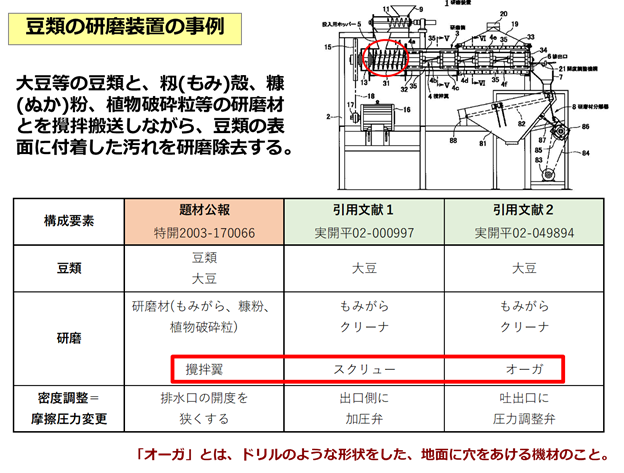 この発明品の研磨装置には豆類を撹拌するための「撹拌翼」を有しています。題材公報では「撹拌翼」と表現されている部材について、引用文献1では「スクリュー」と記載され、引用文献2では「オーガ」と表現されています。