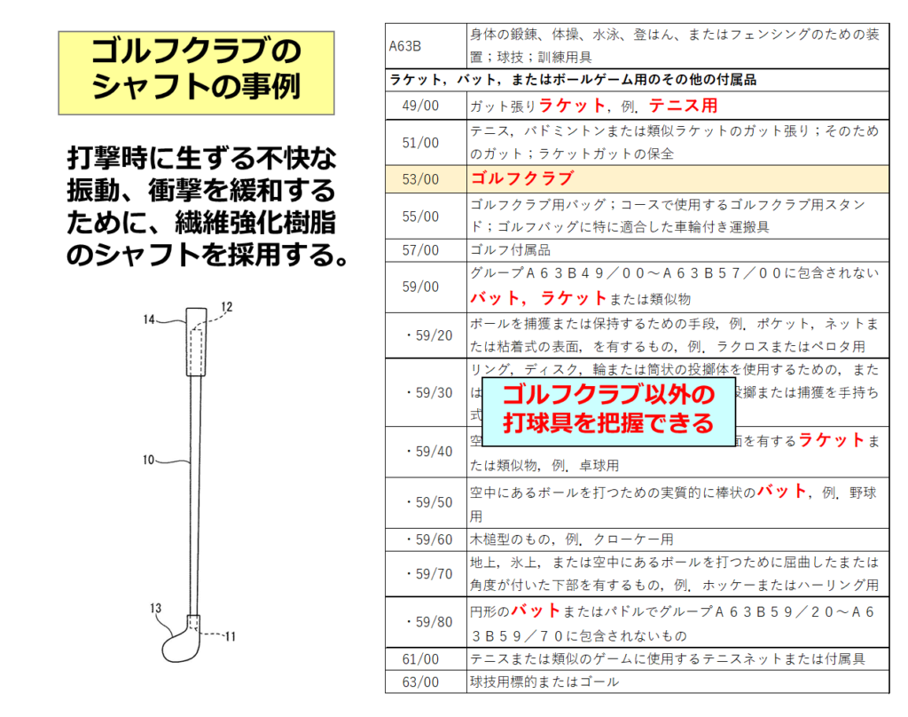予備検索で把握した適合公報には「A63B53/00」というFI分類コードが記載されていました。「A63B53/00」のFI分類表を参照すると、「A63B53/00」はゴルフクラブのFIであることが確認され、検索に使うことができると判断されると思います。このときに、「A63B53/00」の内容確認にとどまらず、前後の分類についても確認すると、ゴルフクラブ以外にも、テニスラケット、野球のバットなどの打球具に関する特許分類が存在することが確認できます。