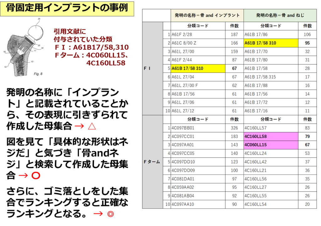 具体的には、「骨andインプラント」により得られた検索集合と、「骨andねじ」により得られた検索集合のランキング集計の結果を比較したものです。適合公報となる引用文献に付与されていたFIとFタームのランキング順位を比較してみると、「骨andねじ」により得られた検索集合において、引用文献に付与された特許分類が上位にランキングされていました。「骨andインプラント」と骨固定外科手術道具全般を含む検索集合よりも、「骨andねじ」のように具体的な固定構造にフォーカスした検索集合にすることで、調査で使用すべき適切な特許分類を特定できます。
