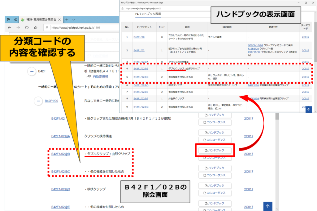 「B42F1/02B」の分類内容は「ダブルクリップ;山形クリップ」と記載され、このFIの内容を理解することは容易ですが、分類内容の説明の中には、その説明文を読んでも内容の理解が難しいケースもあると思います。そんなときには、説明文の右にある『ハンドブック』のアイコンをクリックしてみてください。図6の右上には、ハンドブックをクリックして表示される画面を示しました。
