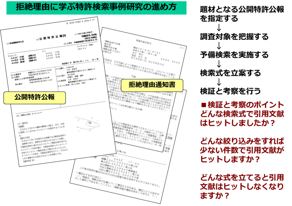 特許検索事例研究とは、拒絶理由に学ぶ特許検索式の立案ノウハウを得るための活動であり、本編で紹介している様々なノウハウやかんどころは、過去に事例研究を行って得られたものです。