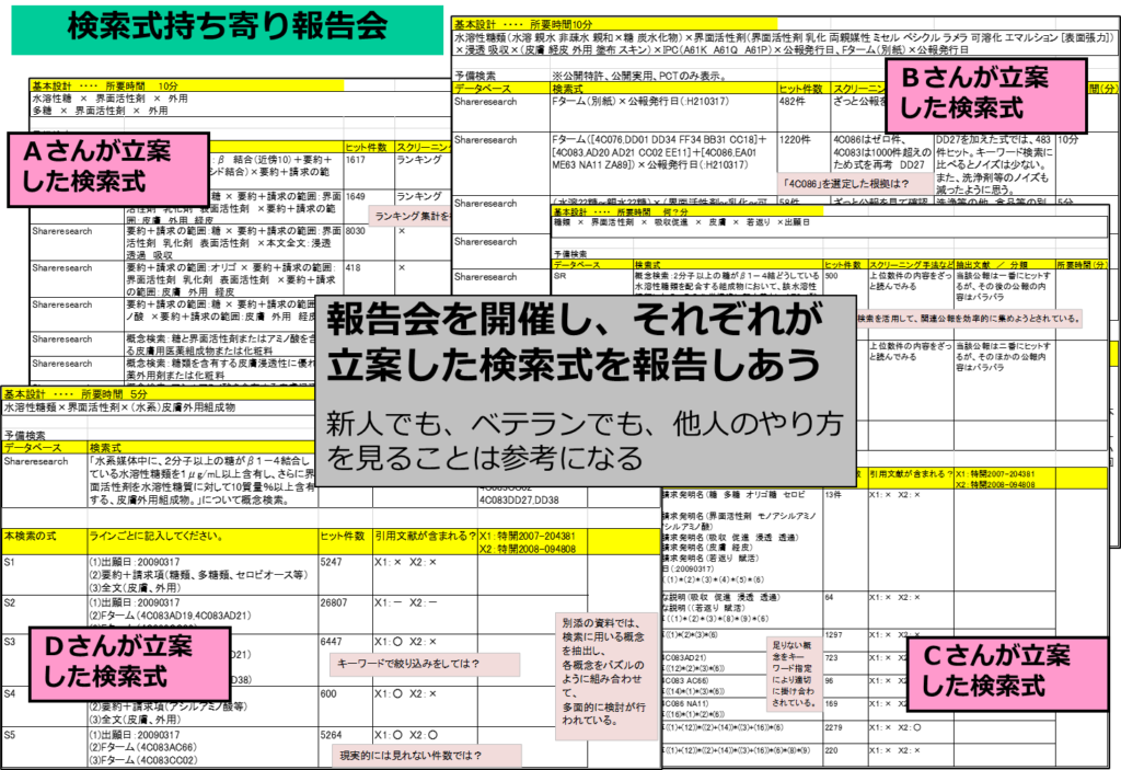 検索式立案プロセスを学んだ後には、できるだけ数多くの案件に取り組み、学んだ手法を自分のものにしていく必要がありますが、同時に、それぞれの案件に取り組むことで得られた新たな知見を蓄積していくことも重要です。
