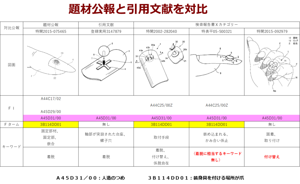 特許分類について比較してみると、5件全てに共通して付与されているFIとして「A45D31/00:人造のつめ」が認められました。Fタームについては「3B114DD01:装身具の付ける場所が爪」が、引用文献には付与されていませんでしたが、5件の関連公報のうち、3件の公報に付与されていました。