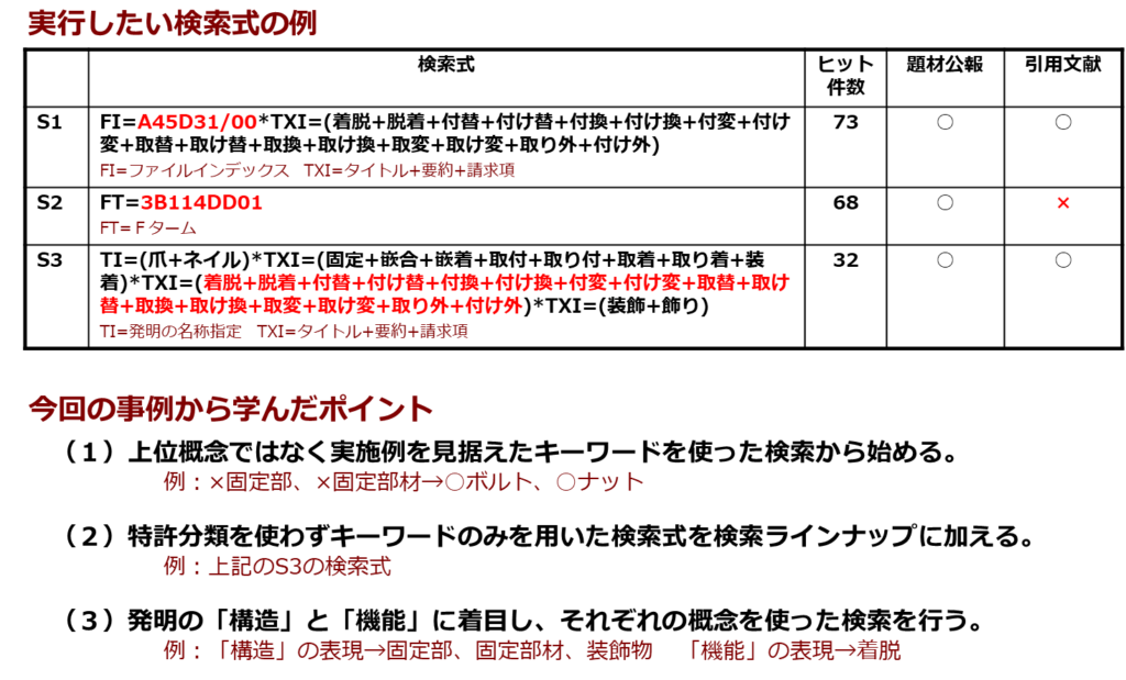 学びのポイントとしては、キーワード類義語展開に関する知見と、キーワード指定のみの検索式を加えることと、「構造からのアプローチ」と「機能からのアプローチ」を行うことの重要性の3つを選定しました。