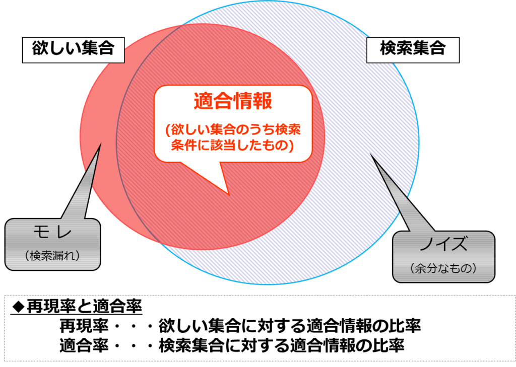 欲しい集合のうち、検索集合に該当したものを「適合情報」といいます。逆に、欲しい集合の中で、検索集合に含まれなかったものを「モレ(検索漏れ)」といい、検索集合に含まれているが、欲しい集合に含まれないものを「ノイズ(余分なもの、不要なもの)」といいます。