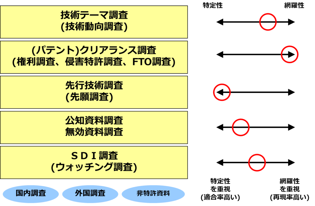一言で「特許調査」といっても、特許調査の目的に応じて、いくつかの種類に分けることができます。図3には特許調査の種類と網羅性の考え方を示しました。