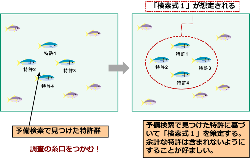 具体的には、予備検索で把握した特許公報に付与されている特許分類や、説明文の中で使われているキーワードを参考にして、検索式を策定します。図7に示したとおり、予備検索で見つけた特許1,2,3,4の特許群を包含するように検索式1を策定することになるので、適合公報がたくさんある方が、正確な検索式1を策定することができます。しかし、今は予備検索の段階であり、あくまでも事前準備という位置づけになるので、多くの時間をかけられないのも事実です。