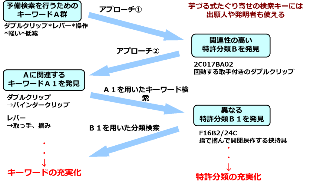 アプローチ①の検索により把握された特許分類を使って、アプローチ②の検索が行われています。次に、アプローチ②の検索により把握された新たな類義語を使って検索をすると、新たな関連する特許分類を見つけることができました。このように、得られた情報を糸口にして特許分類やキーワードを充実化させることができるのです。