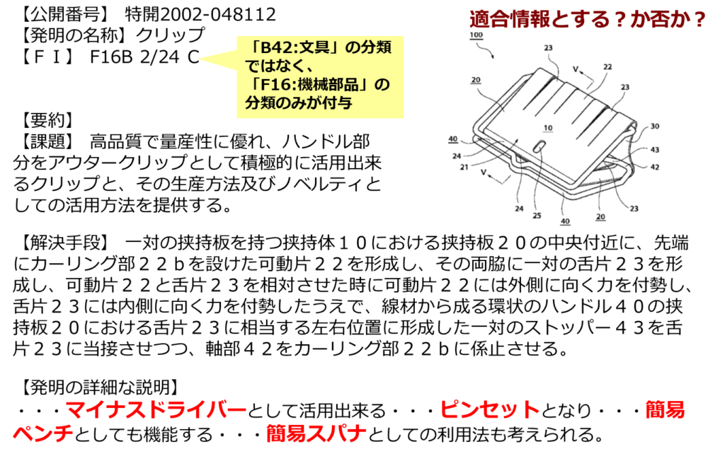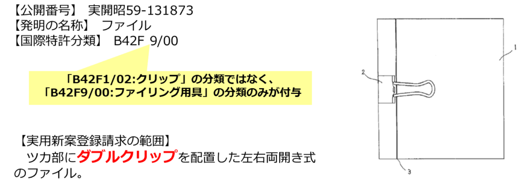 アプローチ①で得られた適合公報に付与されている特許分類を確認すると、以下のダブルクリップに関連するFIとFタームを把握することができました。
