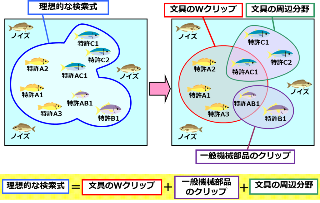 図12に示したとおり、「特許A群:文具のダブルクリップ」と「特許B群:一般機械部品のクリップ」と「特許C群:文具の周辺分野」の全てを、周りに存在する「ノイズ」を含まないように検索するためには、奇怪な形状である「理想的な検索式」を一発で指定しなければいけません。しかし、理想的な検索式を一発の網掛けで引っ張り出すのは困難です。