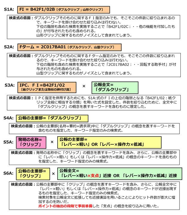 「特許A群:文具のダブルクリップ」を見据えた検索式として、S1A~S6Aの検索式を立案しました。