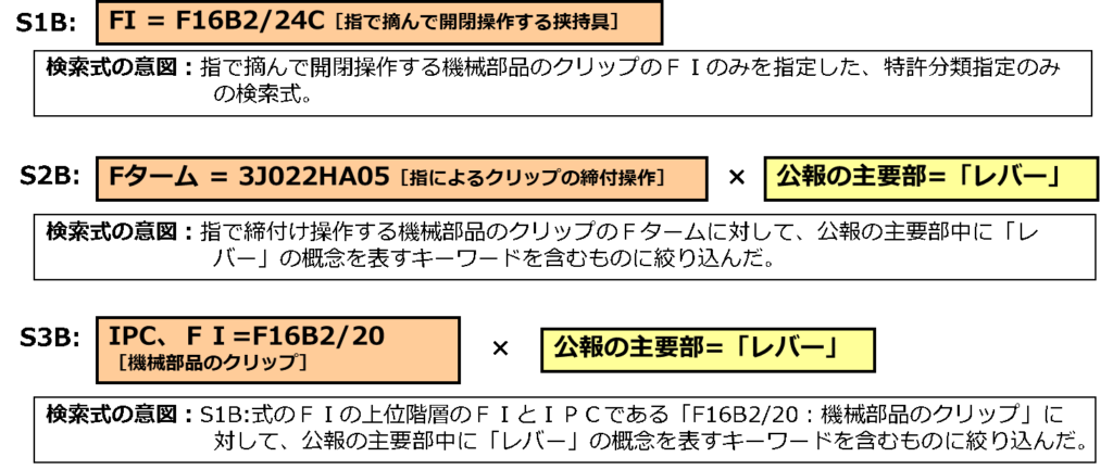 「特許B群:一般機械部品のクリップ」を見据えた検索式として、S1B~S3Bの検索式を立案しました。