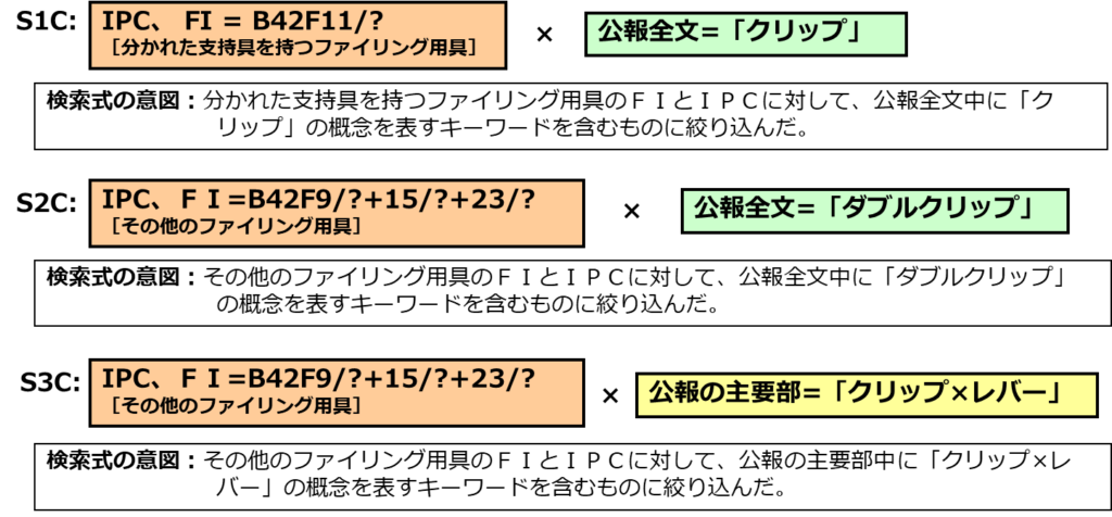 「特許C群:文具の周辺分野」を見据えた検索式として、S1C~S3Cの検索式を立案しました。