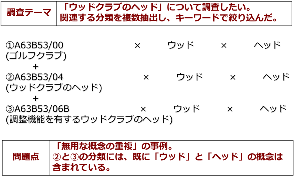 この場合、①の検索式については何も問題はないのですが、②の検索式と、③の検索式については少し問題があるように思われます。すなわち、②と③の特許分類の内容を確認してみると、特許分類そのものに「ウッド」という概念と、「ヘッド」という概念が両方とも含まれているのです。つまり、キーワードを掛け合わせなくても、特許分類を指定して検索するだけで、ウッドクラブのヘッドに関するものに絞り込まれているということになるのです。