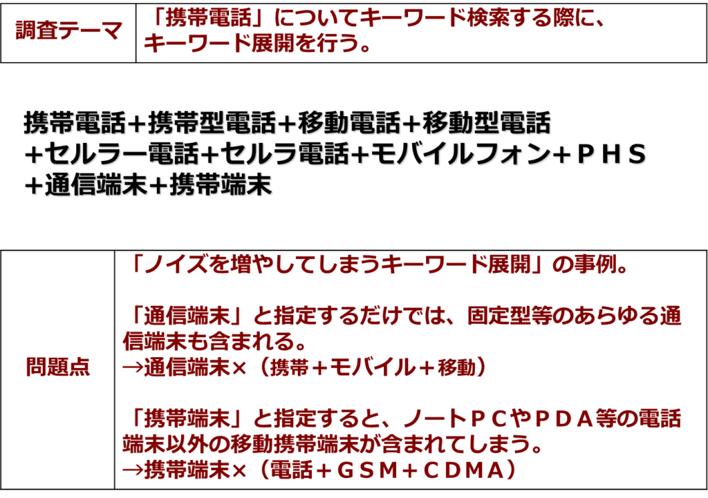 次に、検索概念に相当する類義語展開のやり方に問題がある失敗事例を紹介します。調査テーマは「携帯電話」に関する特許調査です。