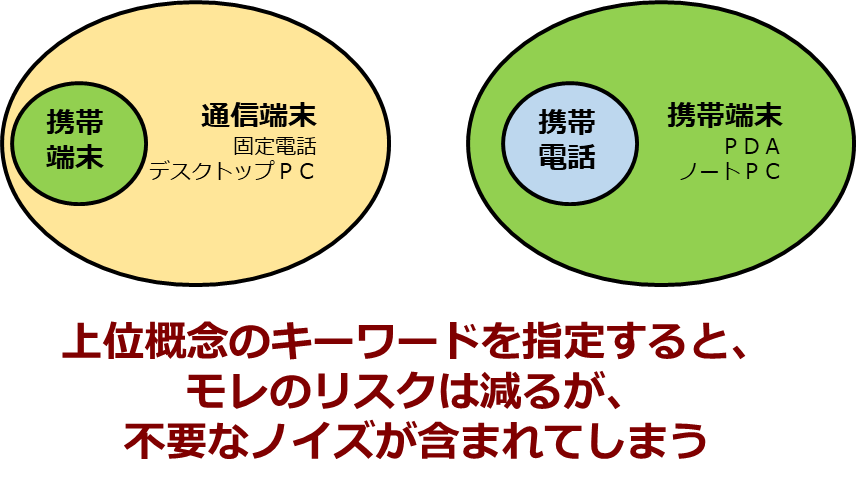 この場合、図16に示したように、上位概念に相当するキーワードも類義語展開に加えたことで、モレのリスクは少なくなりましたが、「PDA」や「ノートPC」といった、携帯電話とは異なる『携帯端末』がノイズとして含まれてしまいました。また、「固定電話」や「デスクトップPC」などの、携帯電話とは異なる『通信端末』のノイズも含まれることになりました。
